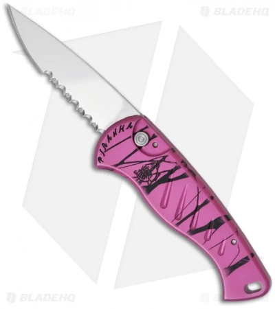 The Piranha Fingerling is a functional and stylish automatic knife. The action is fast and lockup is solid, so hang on tight! This Fingerling has a mirror finished drop-point styled 154-CM stainless steel blade with a plain cutting edge. The lightweight and sturdy 6061-T6 aluminum handles are black anodized and feature recessed grooves for added gripping power. The knife is very thin, which makes it quite comfortable to carry with the tip-up titanium pocket clip.
