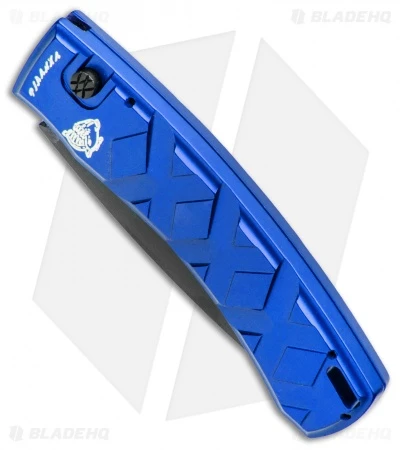 - Blue anodized handle with X’s on it.